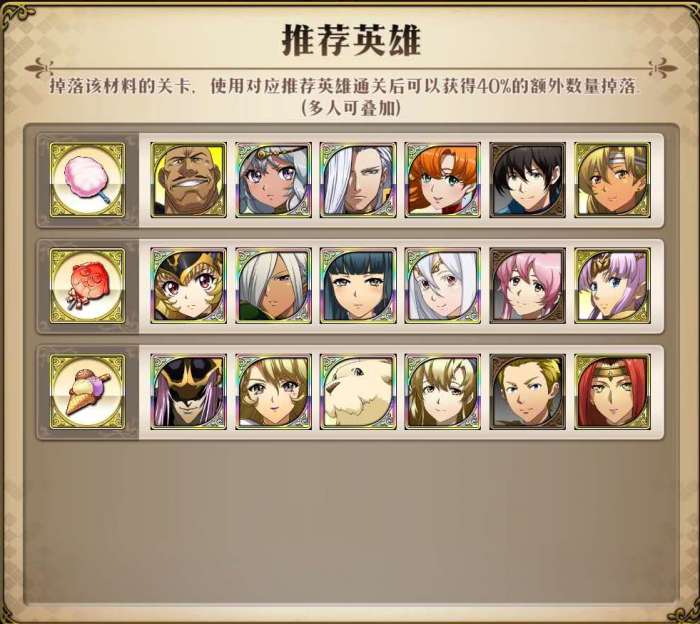 掉落材料的关卡,使用对应推荐英雄通关后可以获得40%的额外数量掉落(多人可叠加)