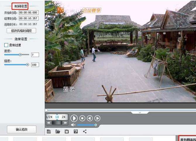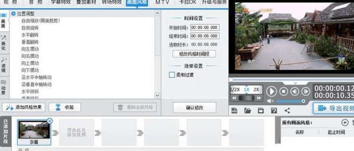 6、在右下角的所有画面风格栏,可以看到添加的画面风格;选中画面风格,在时间设置栏可以调整风格开始和结束的时间;在效果设置栏还可以该调整风格的效果。