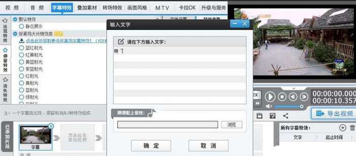 3、上方的菜单栏中选择字幕特效;双击要在视频界面添加字幕的位置;在弹出来的文字输入框中输入文字;文字输入好后,点击确定。
