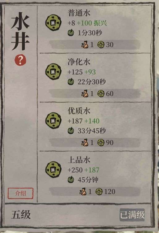 五级的水井,最小单位操作时间在90S,而配合游戏机制30S内的可以免费加速,实际上水井的单位时间是60S。
