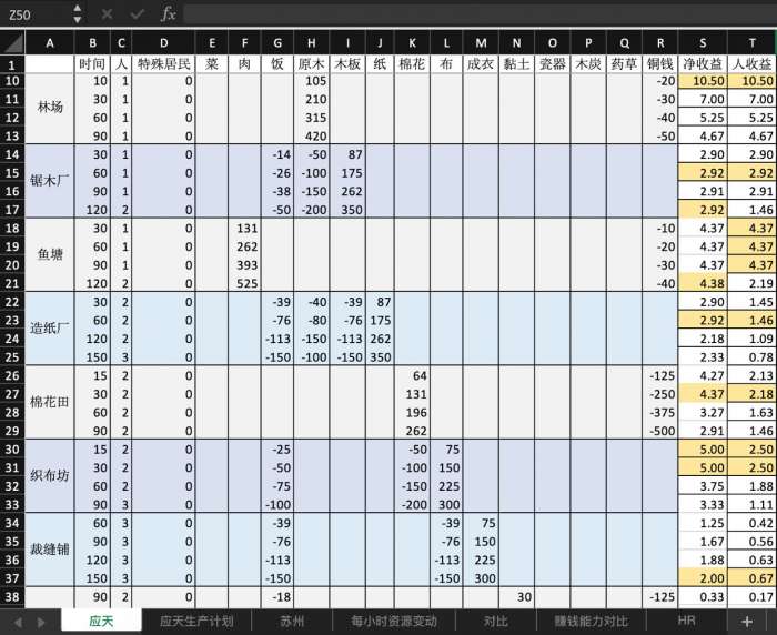 4、 为了保持页面整齐,苏州的林场和锯木厂未列出,两地仅影响加成数值,不改变产出效率。