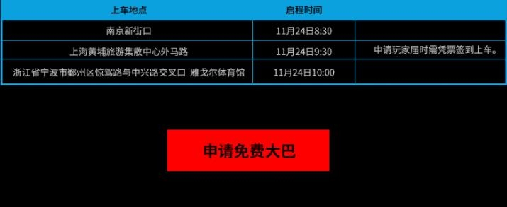 本次购票玩家将有资格申请免费大巴接送,仅供南京、上海以及宁波地区的购票玩家申请,名额有限。官网将会直播本次FSPL总决赛,直播过程中将会送出观战礼包以及稀有道具。