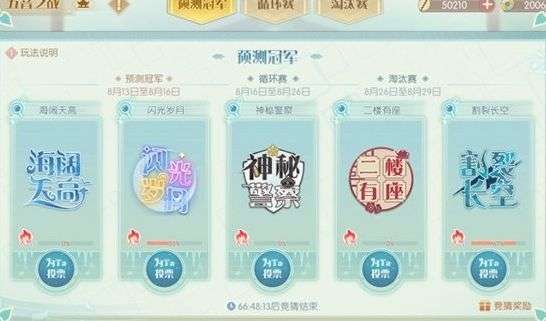 <预测冠军>-少主能在预测冠军阶段查看队伍的构成并选择自己心仪冠军队伍,根据队伍最终的排名,可获得丰厚奖励。除最终冠军决战赛之外,每一场循环赛和淘汰赛都可以在当天进行预测,所投票的队伍在当天的循环赛或淘汰赛中获得胜利,少主也可获得相应的奖励。