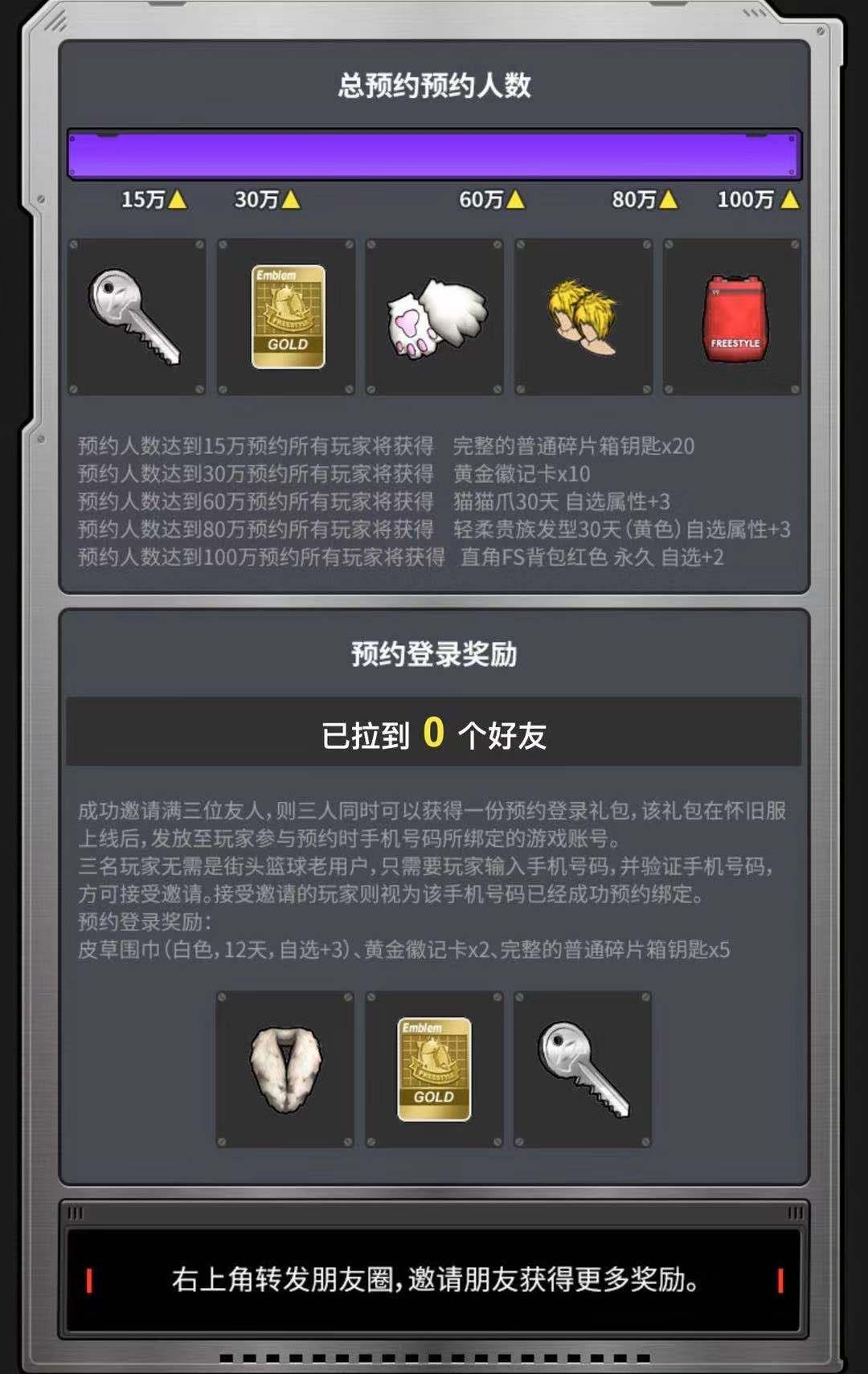 预约每达到一定人数就可以获得相应的奖励,分别是20个完整的普通碎片箱钥匙、10张黄金徽记卡、30天自选+3猫猫爪、30天自选+3黄色轻柔发型以及永久自选+2直角FS背包。