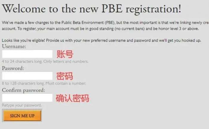 不出意外的话,点完黄色按钮后会让你输入账号密码,这就是PBE账号的注册页面了。