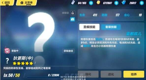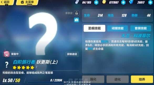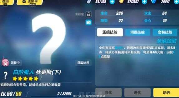 物理攻击提高30%,普通攻击每1秒获得1点充能,最多5点。释放必杀技消耗所有充能,每消耗1点充能,回复80点生命值。
