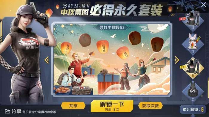 通过完成任务获取解锁次数,完成解锁中秋集图18次即可获得六六大吉套装(永久)。