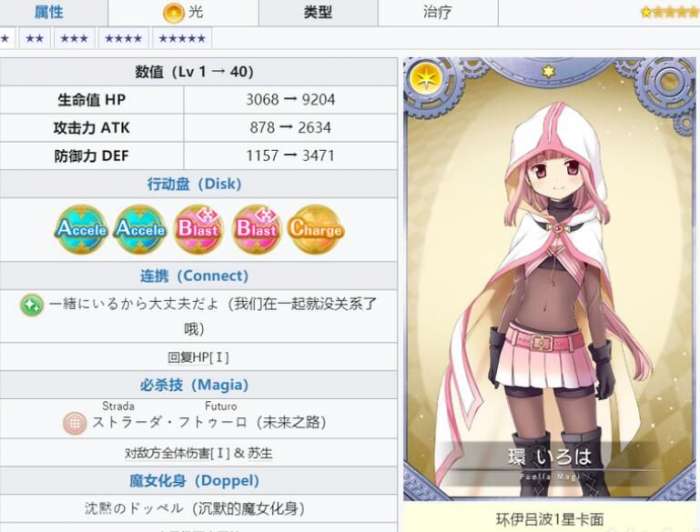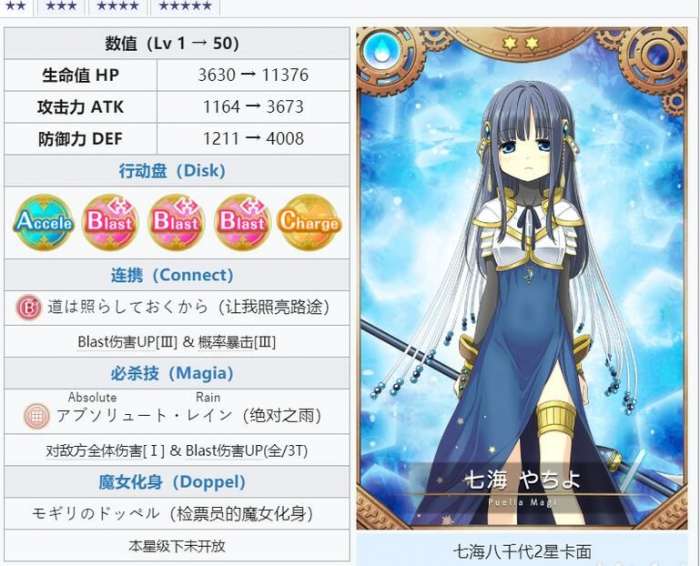 高攻击固然是一个好打手必备的能力,但玲奈又得天独厚具有AAA的Disk,可接连不断使用魔法输出很高的持续火力,相当好用,因此我认为可以担任多数队伍的核心。游戏开局前中期即使其他队友都二星很弱也没关係,靠她一个人集魔法自干就够推到后期难关了。连携的辅助能力也很不错,可以强化队友的攻击力与MP,还附赠爆击,配合群攻BBB的队友正好可以补足玲奈较贫弱的多体伤害。攻高集魔快好开局,不用依赖队友,连携又强,因此个人对玲奈的评价很高。3A型的缺点是B卡只有一张,不适合一般小怪多的地图,但是3A型能帮助集Magia在攻略难度关卡时作为队员非常优秀实用。