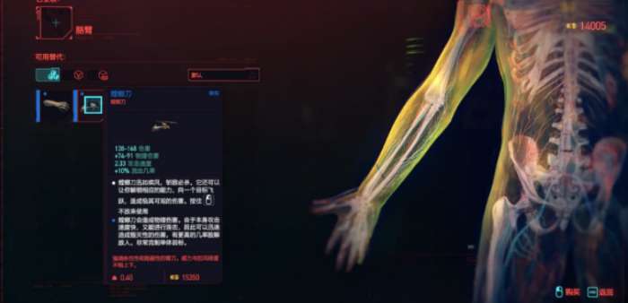 需要注意的是,螳螂刀并不算在武器分类,而是安装在手臂的义体。因此在武器店你是无法购买的,需要去义体医生那里进行购买与装备。