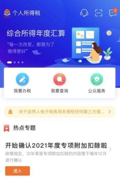 第一步:在“个人所得税”APP首页点击“开始确认2021年度专项附加扣除啦”专题或“专项附加扣除填报”。