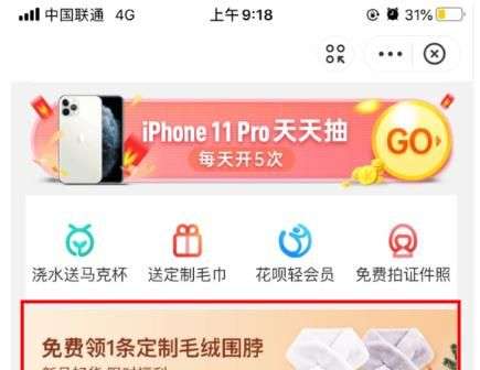 2、进入该小程序后,在首页可以看到“免费领1条定制围脖”活动,点击进入