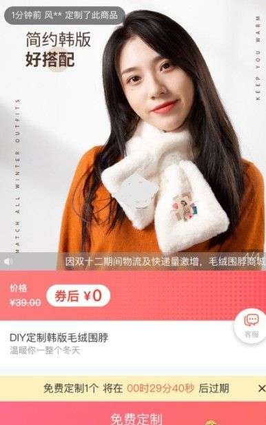 这款围脖定制是免费的,但是需要支付快递费用,介意的朋友勿拍。不过相对来说还是挺划算的,几块钱就能够获得一条围脖,不妨试试。