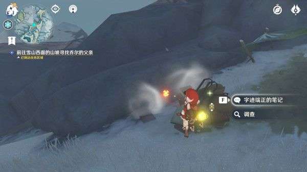 在到达任务区域后,我们可以看到雪堆下隐约露出堆积着的行李,通过火元素攻击融化掉雪堆后(普通雪堆,不需要深赤之石buff),同样是一本字迹端正的笔记。