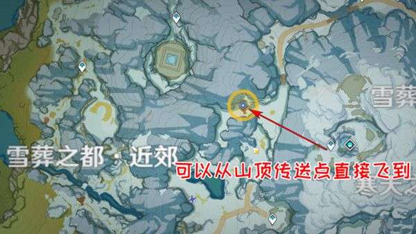 循着小地图的指引,我们来到雪山西面的山坡,前进路线如图所示,可以直接从雪山山顶的传送点飞到(尚未解锁山顶的小伙伴可以从其他位置绕路过来,追踪任务有明显的黄色光柱提示)。