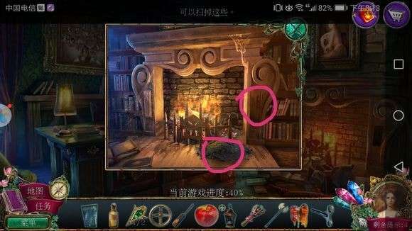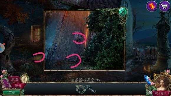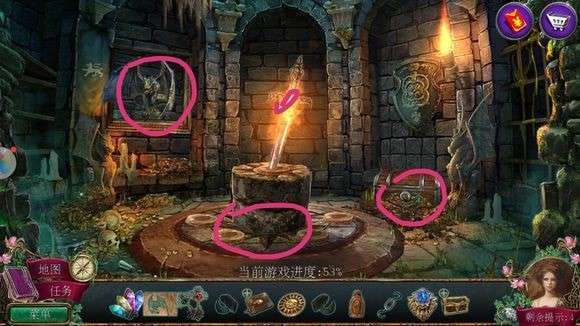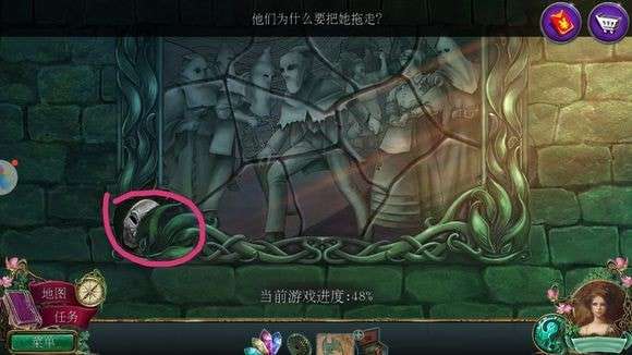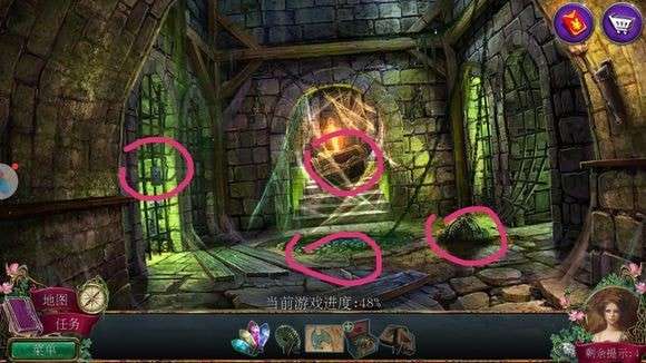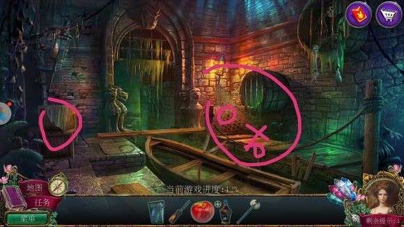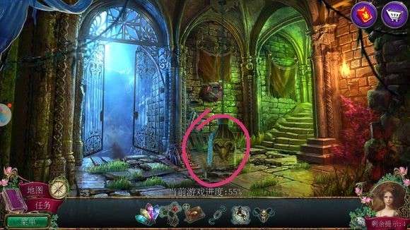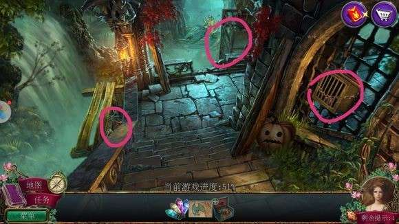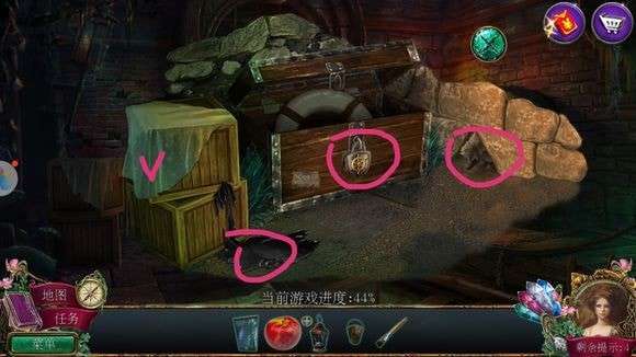 火把右侧,墙面——用园艺剪刀——(点击让所有骨头消失)——骷髅