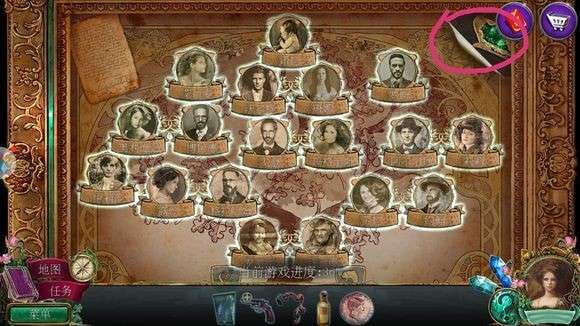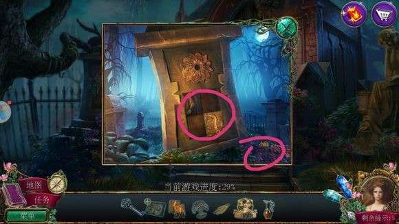 右侧墙上墓石——用雕刻工具——按提示点击符号——书中印记、浮雕碎片②、箱子符号、肖像①