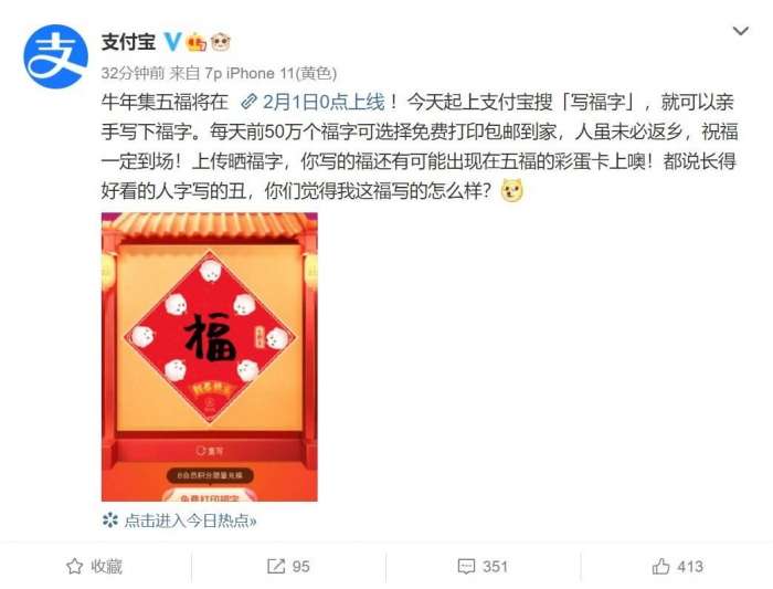 支付宝官方宣布,2021年集五福活动将在2月1日0点上线。同时,今年新增写福字玩法,今起上支付宝搜「写福字」,通过小程序手写福字,可选择免费打印、包邮到家。