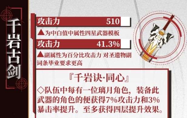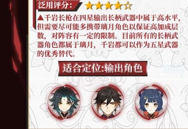 「千岩古剑」和「千岩长枪」是自身素质十分优秀的武器,适合绝大多数双手剑以及长柄武器输出角色使用。作为「狼的末路」与「护摩之杖」武器池的副产物,抽到不亏,推荐培养。但其被动需要璃月阵容的加持,对阵容有一定的限制。四星武器天生的低白值缺陷使得「千岩」系列仅能作为没有五星毕业武器时的过渡之选,上文所介绍的阵容中,输出角色携带「千岩」武器也并非最优。在主C拥有毕业武器且队伍中角色以璃月为主的情况下,「千岩」系列武器更适合给副C携带。虽然「千岩」是限定武器,但若不追求五星武器「护摩」和「狼末」,则不推荐为了「千岩」去抽取本期祈愿池。