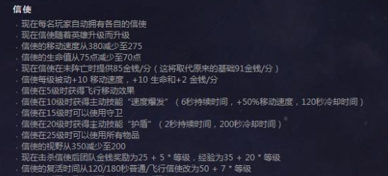 而信使也随之进行了改变!从之前的“辅助买个鸡!”变成了每个玩家开局自动拥有各自的信使,而信使的等级也随着英雄的等级升级而升级!当你带着一把刀与属于你自己的鸡去到中立野区时,有没有生出一股一人一鸡走天下的感觉!而地图也随着新版本的更新而进行了改变,英雄等级也可以升至30级。升至30级后将解锁整个天赋树。需要的经验3500/4500/5500/6500/7500。25级后复 活时间不会增加。经验奖励在25级奖励数值时达到上限。