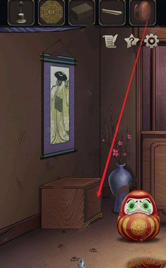 35.在柱子上面拿到剪刀,点击柜子下面的锁,这个锁就是前面木桶上面的图案,如图进行调整,可以得到鬼面虫诱饵35.1.2