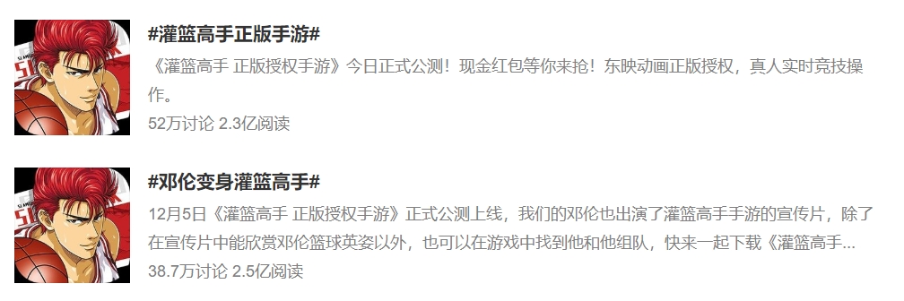 正因为双属性的完美契合,这对组合在微博产生了巨大的声量。包括#邓伦变身灌篮高手#、#邓伦灌篮高手#、#灌篮高手正版手游#等话题频频冲高,多次跻身微博热搜前列。与此同时,相关话题的讨论度也是不断上涨,光是#邓伦变身灌篮高手#的话题阅读量就超过了2.5亿。#灌篮高手正版手游#的话题阅读量也超过了2.3亿。这都得益于这次娱乐游戏的强势结合,《灌篮高手正版授权手游》取得了开门红。