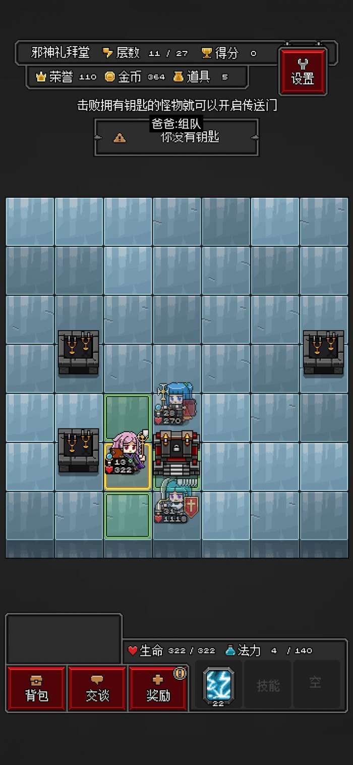 3. 最多可以控制三个角色,每个角色装备不同效果的装备和技能,需要根据各自定位进行战术安排。比如战士T的话,需要血量和生命回复(每次过关会血),弓手是普弓暴击,法师带蓝量和蓝回复。