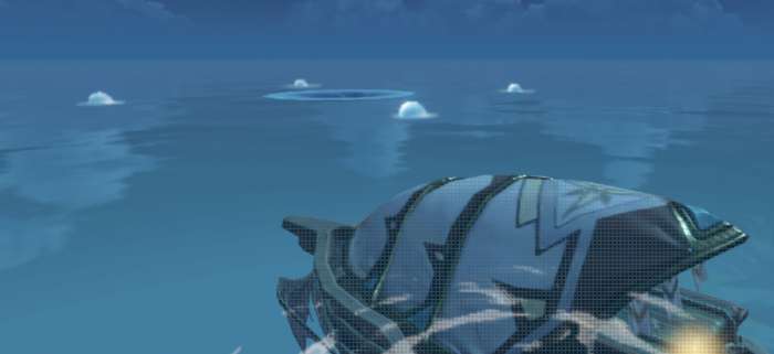 然后在小岛的周围能看见四个水泡泡和一个小漩涡,然后我们一踩脚蹬子,直接就冲进去
