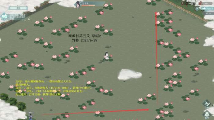 主线剧情:与老爷爷对话,给海棠花浇水。获得水桶。路过水井,打满水。打败无赖(6-1890-1000),获得50铜钱、20个武林点。然后浇水。返回与老爷爷对话,获得100铜钱。主线完成。