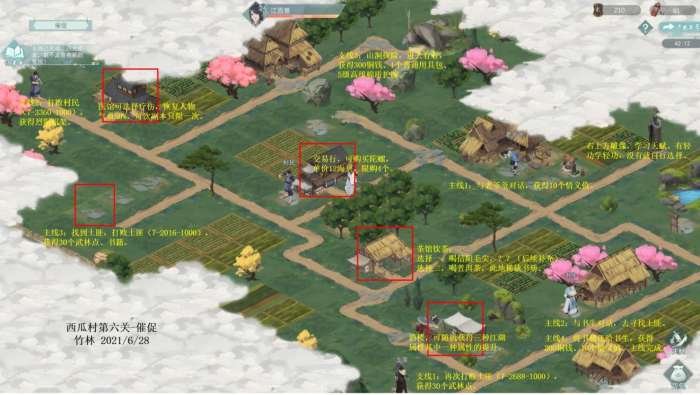 主线剧情:进去直走,遇到老爷爷触发剧情,打跑小贼(3-1134-1000),获得50铜钱、20海贝。帮老爷爷买灯油,去交易行花费16海贝,购买灯油4个。(千万别立马卖出,3海贝1个,亏死)。给老爷爷灯油1个,获得西瓜1个。继续直走触发回忆剧情,右上雕像天赋优先选轻功,其余随意。继续闲逛找到偷西瓜的小贼。打败小贼(3-1512-1000),获得铜钱500、5个武林点。主线剧情结束。