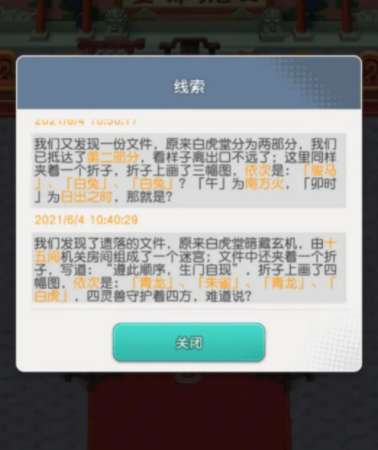 首先讲讲如何通过必经房间,也就是与谜题相关的房.间。进入第一间屋子在打掉门口的两个守门旗子后,可以看到地上散落的线索提示。根据线索“青龙、朱雀、青龙、白虎"提示我们可以知道前四个房间的方向分别在"东、南、东、西",照此方向分别走四个房间便可直通第二层,解锁新的谜题。