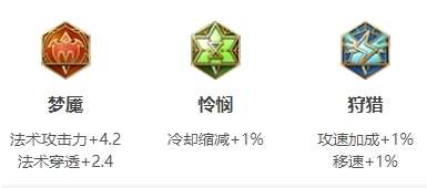 红色梦魇提供了法术攻击和法术穿透的加成,可以在前期让芈月有非常高的伤害,芈月的持续伤害源于技能和被动,因此选择可以增加攻速的铭文狩猎。绿色选择怜悯,减少芈月技能冷却的时间。