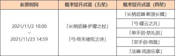 活动期间,限定四星武器「长柄武器·断浪长鳍」「弓·曚云之月」、四星武器「单手剑·祭礼剑」「双手剑·雨裁」「法器·流浪乐章」的祈愿获取概率将大幅提升!