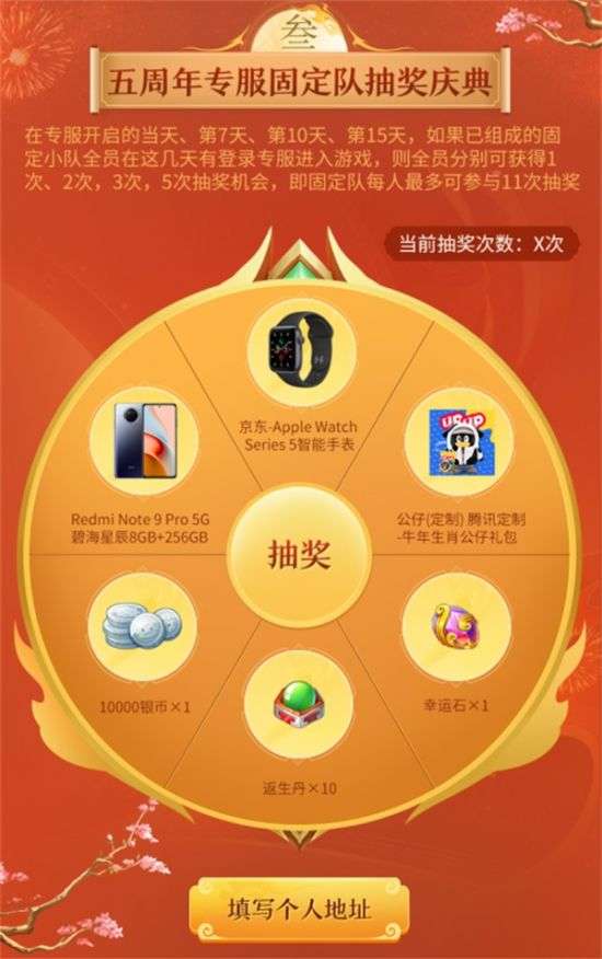 五周年专服开放后,成功组建为固定队的队伍,全员在包括专服开启当日、开服第7日、开服第10日和开服第15日登录游戏,即可分别领取到1次、2次、3次和5次抽奖机会。每次抽奖消耗1次机会,有机会获得包括京东-Apple Watch Series 5智能手表、Redmi Note 9 Pro 5G碧海星辰8GB+256GB、游戏周边、游戏道具等在内的福利奖励。