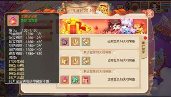 五周年之际,只要在对应的时间内登录,即可免费领取对应的奖励,整个活动持续1个月,在活动期间内登录游戏不仅可以领满所有奖励,还可以在最后一天领取到【年兽宝宝袋】,打开可获得魔兽年兽!