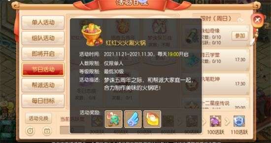 庆祝五周年,帮派内即将举行盛大的晚宴,吃什么呢?当然是一起来涮个热气腾腾的火锅宴啦!大家齐心协力,调味出美味的火锅吧,饱餐一顿的同时,还能获得丰厚的奖励哟。