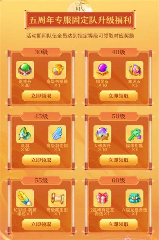成功组建为固定队的队伍,全员在活动时间内达到30/40/45/50/55和60级的指定等级,都能领取一份相应的升级福利。必须全员等级达到指定等级才能领取哦。
