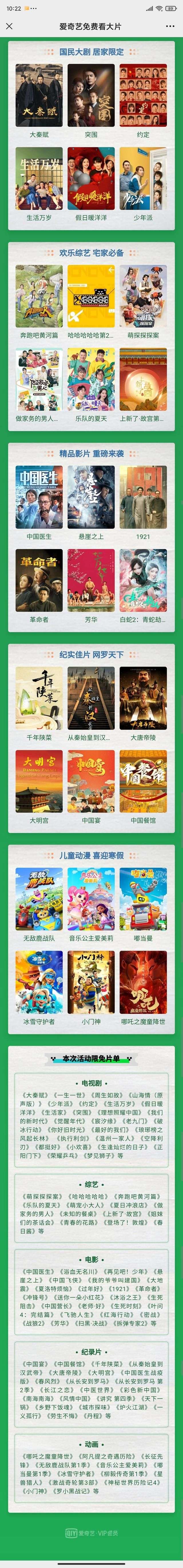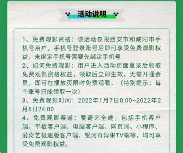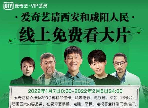 爱奇艺VIP会员今天表示,请西安和咸阳人民线上免费看大片,从2022年1月7日0:00-2022年2月6日24:00,爱奇艺方面表示精心准备了200余部精品佳作,涵盖电影、电视剧、综艺、纪录片、动画等五大内容品类。仅限西安和咸阳的手机账号用户。