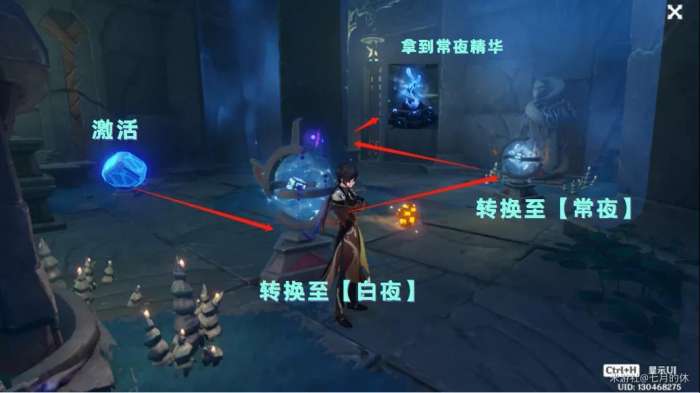 2、引爆炸药桶,炸出一道门,把【日月回轮】转换至黑夜状态。然后按照下图指引操作。