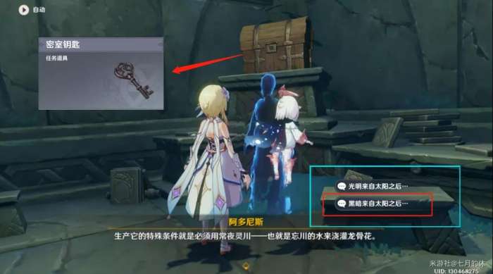 与残魂【阿多尼斯】对话,选择正确的暗号:黑暗来自太阳之后....,普通宝箱打开,获得【密室钥匙】,有个密室解密要用到(与本世界任务无关),我们在讲解完本任务流程后会讲解密室解谜。
