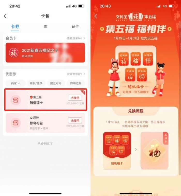 在集五福活动开启之前,就有开福气盲盒的活动,通过开盲盒能得到随机福卡,不过获取随机福卡的活动已经结束,之前得到过随机福卡的小伙伴,可以用随机福卡去兑换自己想要的福卡,是可以兑换到敬业福的哦!另外还有比较常规获取福卡的方法,就是去做活动任务。