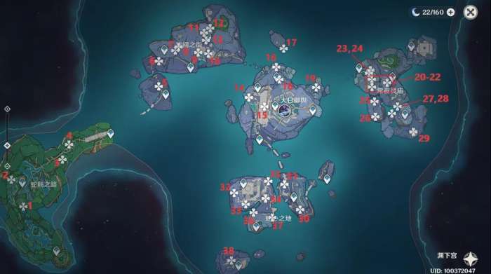 2.4版本新增的渊下宫的仙灵共计39个,下图有38个。剩下的一个是过去图书馆中引导回现在的那个。