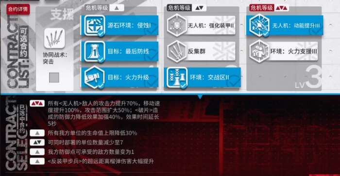【无人机:动能提升III】所有敌人的攻击力提升70%,移动速度提升100%,攻击范围扩大50%; 造成的防御力降低效果加强40%,效果时间延长5秒
