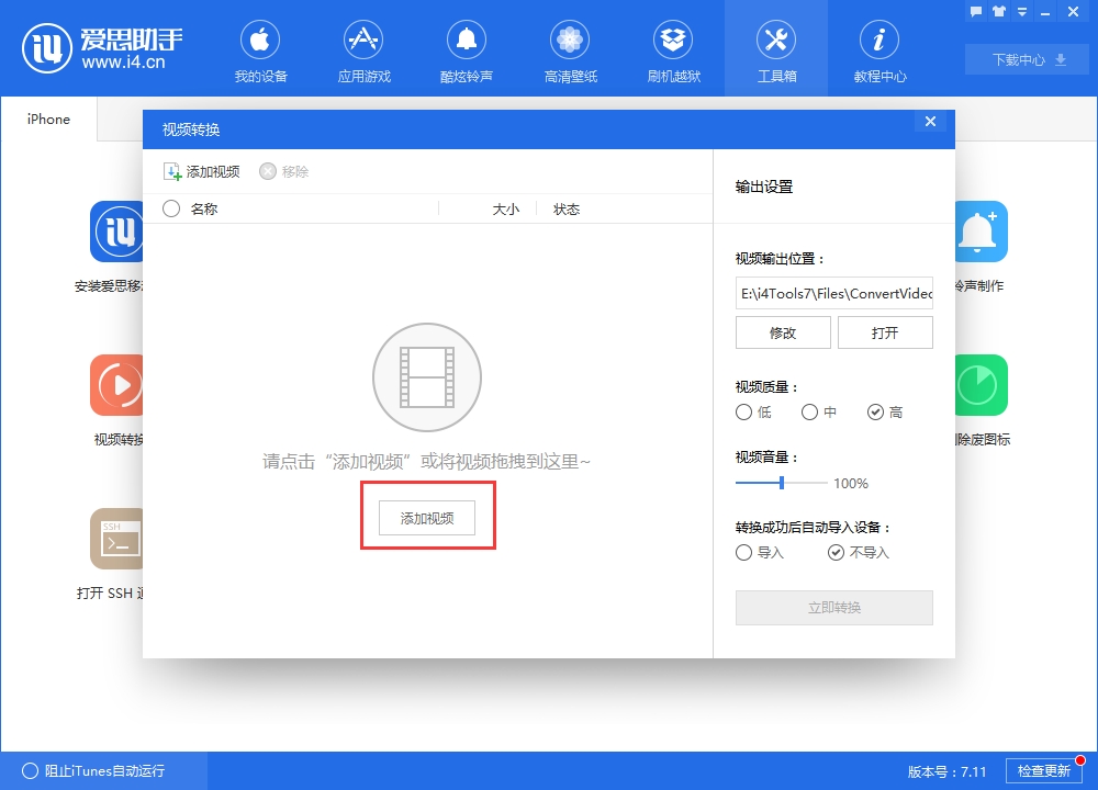 1、打开爱思助手PC端,点“工具箱-视频转换”进入视频转换界面;