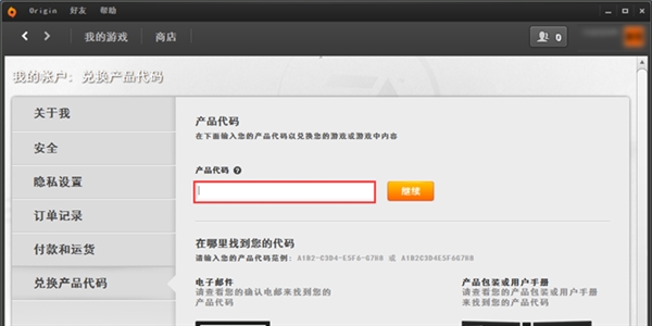 3、打开"兑换产品代码"界面后,在图示的输入框中输入你收到的游戏KEY,点击"继续",然后按照官方提示,即可迅速完成游戏KEY的激活,下载游戏即可玩到!