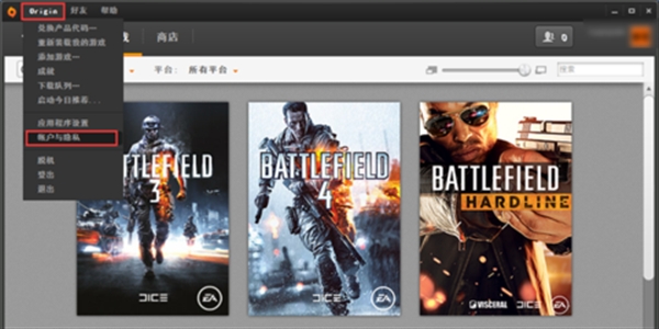 1、启动Origin橘子游戏平台,并成功登录,点击Origin橘子游戏平台左上角的origin按钮,选择"账户与隐私";