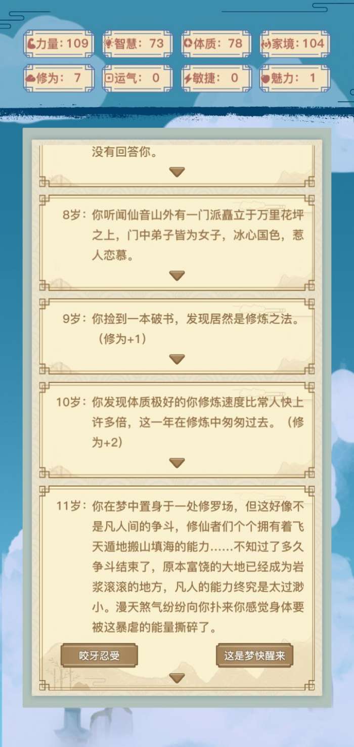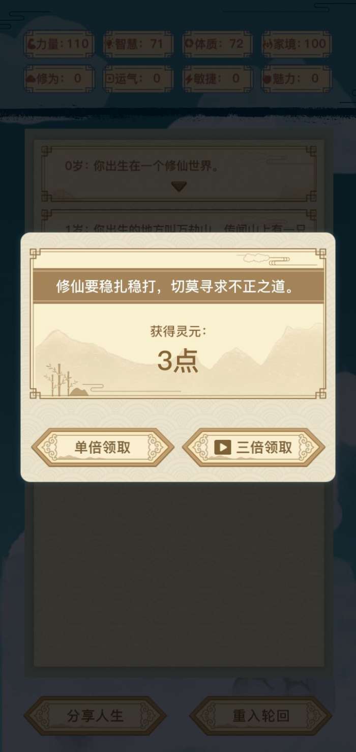 在这个世界,你最好把你的价值观给掰正。不然更容易死。遇到落单的修炼者是直接攻击,然后立马逃走,最后一道雷劫。一直点挣扎。一位大佬曾经说过买东西的时候把家境全部花光,推荐你们去看那个800岁怎么选的攻略,那才是真大佬,我这里补充一些坑爹的。如果有人还有别的疑问的话,评论吧,我看到尽量回复。