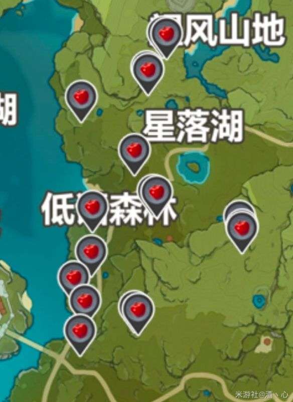 苹果在低语深林,星落湖和望风山地都有分布可以跟着点去找没有的小伙伴。