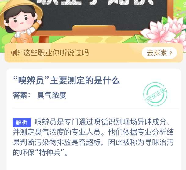 “嗅辨员”主要测定的是什么?【蚂蚁新村每日一题】2026年4月1日题目新鲜上线啦!今日答案是:【臭气浓度】。每日坚持答题,不仅能积累木兰币为小镇建设添砖加瓦,更有惊喜奖励等你来拿。只要答对今日题目,即可立即享受“产速+3/时”的加速福利,让你建设小镇的步伐更快一步。