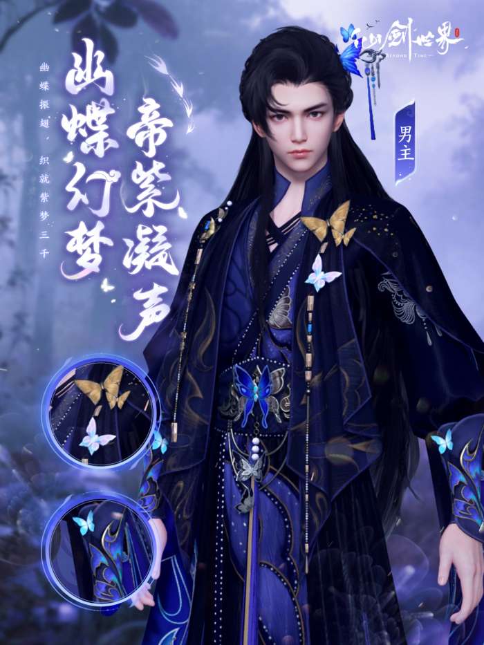 男款服饰气宇轩昂,犹如冥谷之主飘然出尘,玄墨锦袍印有金色暗纹,护腕上两只浅蓝色的蝴蝶在墨色中泛起幽光,发间斜插着坠珠簪子,似有蝶栖云鬓。