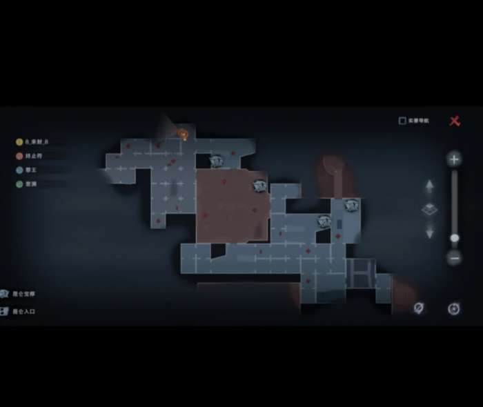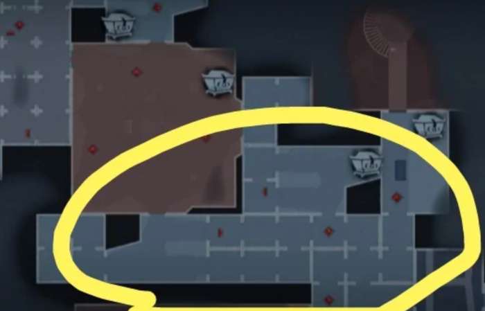 这里指从正门或者侧门一进来就能看到的区域,是一片密集的白色格子,浅蓝色的格子代表水下有相同的路,如果说没有带传送可以通过白格区反向去找正门和侧门来撤离。